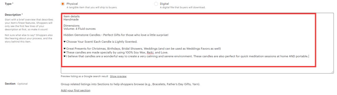 比如:我们在首页输入一个关键词 “candles” 然后我们出来的就是除了做广告的产品的排名,那么我们在listing这块,如何让我们的自然排名可以更靠前呢? 那么我其实就是需要搜索机制,更匹配! 自己想象的一些关键词和一些标题以及tags肯定是不行的,我们要怎么办呢?必须要借助工具,因为数据是不会骗人的!我们一起来看看这款实用的工具!直奔主题... 网站链接:https://www.keywordtooldominator.com/ 没错,就是这款ETSY专属工具,我们一起来看一遍! 1)点击ETSY的工具 2)注册后,可以点击ETSY工具栏 3)点击可以看全部工具 4)输入产品名称,产品类别或关键字,然后单击搜索按钮! 5)输入产品名称 “candles” 点击搜索,就会正在搜索! 6)显示搜索出来的所有ETSY的关键词,买家的搜索习惯的关键词 按照排名,依次递减! 7)然后勾选你想要的,或者你选择一些,放在右边的框框内,然后作为产品的备用关键词! 另外还有一个,可以获得买家经常输入的关键词数据,就是平台的搜索框内,直接输入关键词,就可以生成!但是,软件的好处在于,可以帮你生成更多,甚至是一个标题都是搜索精准化的关键词! 那么我们有了这些关键词应该用到哪里去呢? 没错,就是产品的listing里面!我们一起回到上架产品过程! 8)我们回到上架产品的步骤,一起来看看怎么添加! 9)首先,ETSY的算法是,三个部分匹配你的整个listing和关键词,然后最符合的优先展示! 放大了看,明确指出了,标题的作用 Include keywords that buyers would use to search for your item.(包含买家用于搜索商品的关键字) 其实就是让我们写关键词! 然后我们根据工具搜索的情况,根据字符限制和优先级挑选,直接填进去即可! 10)然后根据平台首页或者工具出来的关键词,直接书写描述,主要表现在:材质/卖点/适用人群/使用场景/季节/节日等 比如蜡烛这样写: Item details Handmade Dimensions Volume: 4 Fluid ounces Hidden Gemstone Candles ~ Perfect Gifts for those who love a little surprise! ♥Choose Your Scent! Each Candle is Lightly Scented. ♥ Great Presents for Christmas, Birthdays, Bridal Showers, Weddings (and can be used as Weddings Favors as well) ♥ These candles are made specially by using 100% Soy Wax, Reiki, and Love. ♥ I believe that candles are a wonderful way to create a very calming and serene environment. These candles are also perfect for quick meditation sessions at home AND portable. 分成小点,更加有条理性! 11)最后一个是Tags/Materials,也是极其容易被买家所忽略的一个关键性因素! 关于Tags的解释:What words might someone use to search for your listings? Use all 13 tags to get found. 还有一些官方的提示: 当然,我们也是需要通过热搜词和工具整理出来书写的,两个属性标签,极其重要! 可以添加13个Tags和Materials,总共26个,都用工具和我们首页提示的,可想而知,会有多么好的展示效果! 12)总结: 以上就是跟大家分享的,关于ETSY的自然排名,比较重要的一些匹配结果问题,当然我们也可以在后台直接使用广告promoted listing,但是我觉得总归而言,大家在上架的时候把这些事全部做好,都是有利于你的整体排名的,因为你不可能一上来就做广告,也不可能全部产品做广告,更不可能做广告不用关键词! 从我这么多年对于ETSY的了解,平台客单价很高,但是产品类目就这么多,8个主流大类目! 平台是很讲究排名和精细化运营的! 写在最后:平台封店铺概率很高,希望大家可以从专业的角度对待这个平台,不要投机取巧,想了解更多的平台运营开店和店铺运营的技巧和算法问题,可以扫描下方的二维码与我联系,预祝大家开店成功和大卖! 最后给大家看一组店铺数据: