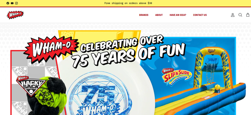 Wham-O Inc.是一家总部位于美国加利福尼亚州的玩具公司。它以创造和销售许多流行的玩具而闻名近70年,这些玩具包括Hula hoop, Frisbee, Slip 'N Slide, Super Ball, Trac-Ball, Silly String, Hacky sack, Wham-O Bird Ornithopter 和 Boogie Board等。
