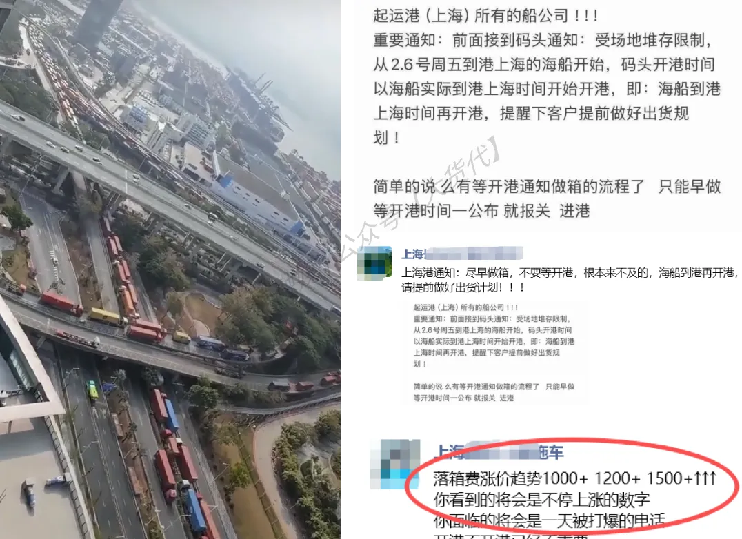 据悉,截至上周末,上海港积压重箱已超过4000箱,爆仓严重,不止约号困难,堵车加剧,拖车费一路暴涨,同时基于目前的拥堵、堆场受限情况,上海港也实行了新的调整——“从2月6号到港上海的海船开始,码头开港时间以海船实际到港上海时间开始开港”。