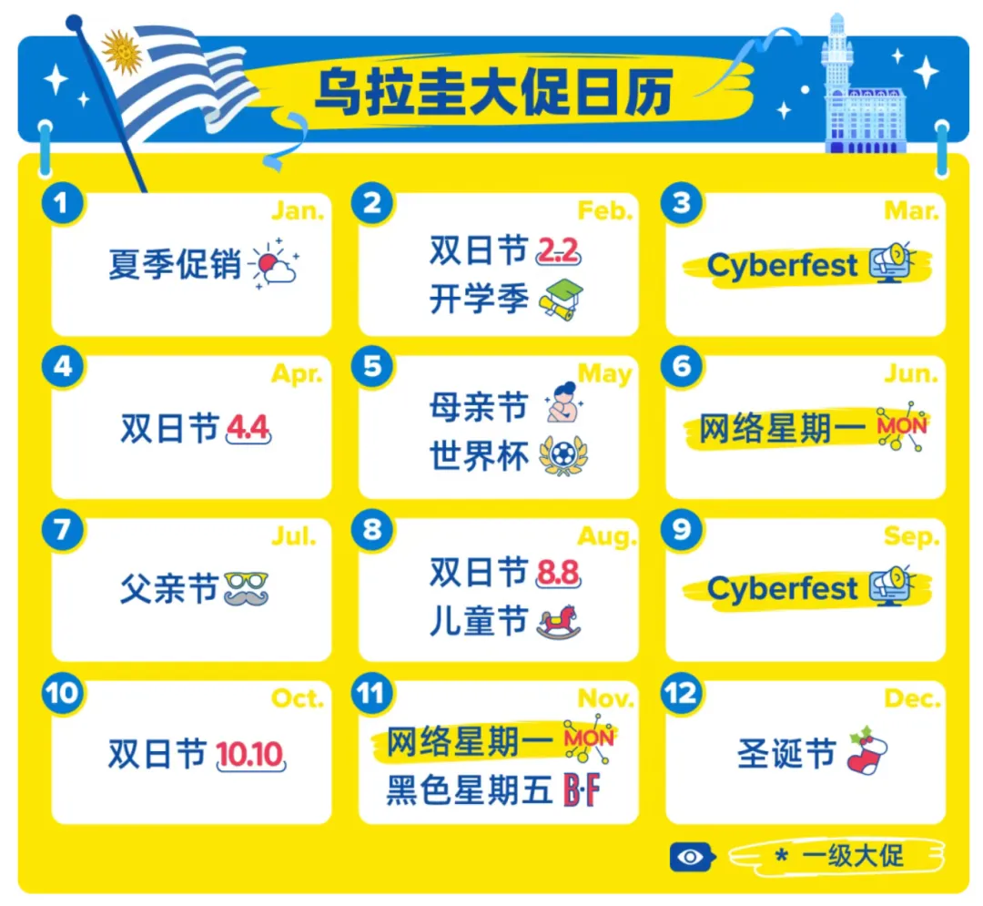 Cyberfest(网络狂欢节)是乌拉圭全年最大的线上购物节,相当于我们的“双11”“618”。现在入驻,正好赶上大促预热和爆发期!平台会倾斜大量流量给新卖家,这是你冷启动最快的机会,错过等一年。