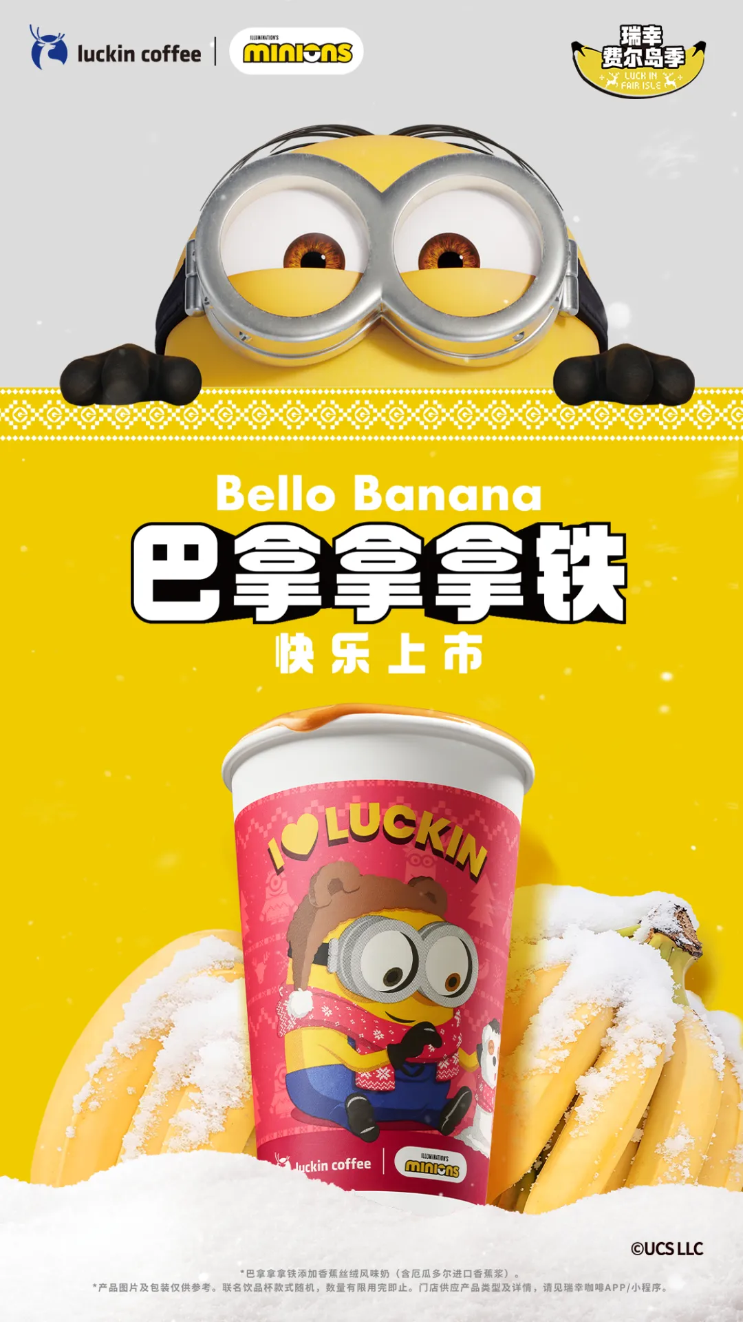12 月 15 日,瑞幸正式与全球爆火的「小黄人」开启联名,双方以小黄人最爱的香蕉为灵感推出新品「巴拿拿拿铁」「香蕉丝绒撞奶」以及「巴拿拿大福」,带来软萌与咖香编织的温暖。