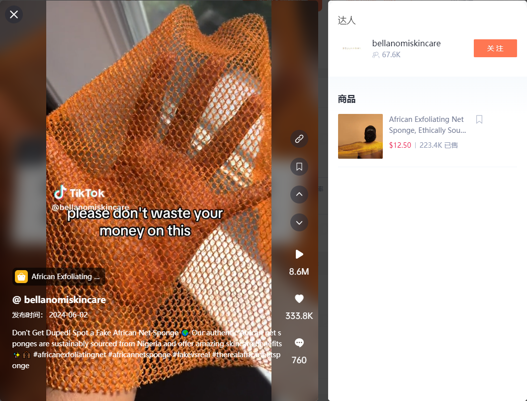 @bellanomiskincare的视频于6.2发布,后台观察到这条视频的播放量达到860万,33.3万点赞。