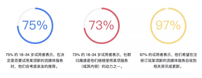 无论是市面上品类繁多的娱乐服务,还是网上现成的丰富内容,消费者常会因选择过多而感到眼花缭乱。事实上,在受访的试用者中,有 71% 的人表示,他们没有时间去试看每一档听闻有好评的节目;76% 的人则表示,市面上的流媒体服务太多,难以一一追踪了解。为了更有效地找到要看的内容,消费者会借助社群的力量:四分之三*的 18–34 岁试用者表示,在决定是否要试用某项新的流媒体服务时,他们会考虑亲友的推荐。