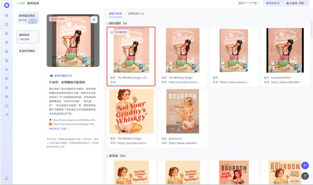 将此次发起维权的产品图片上传至睿观独家自研的版权检测功能后发现, 该产品已有生效版权且已有TRO维权史。