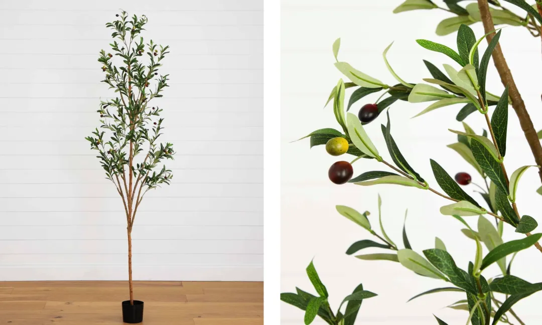 详情页中详细地描述了这颗橄榄树适配的家居装饰风格和只需掸灰的简易的维护操作,并未说明树干、树叶的材质。尺寸方面,品牌提供了11个选项供选择,其中82英寸的(约208厘米)当前促销价是$60。