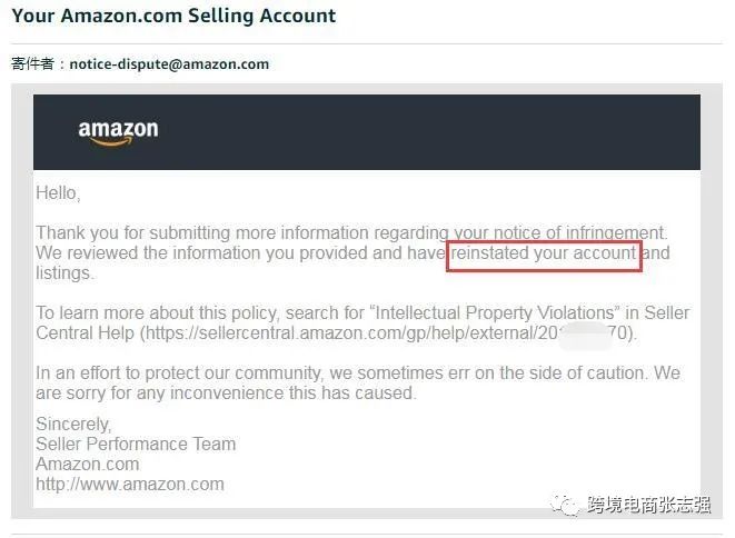 面对这种情况,我内心其实也比较慌乱,从小红旗中能看出利害,我账号价值很高,做了品牌备案,通过了三个类审核,甚至不押款,所以不想轻易让账号挂了。于是我仔细研究出现这个问题的原因,以及想找投诉者谈判让其撤销投诉,事与愿违找通过邮箱联系了投诉者,但是邮件基本石沉大海,他们不回复。我相信有很多小伙伴们会碰到这种情况,然后就不知所措了。但是时间不等人,账号随时可能挂掉,于是我尝试写申诉信。本以为申诉信没能提供发票和授权的情况下绝对不能通过的,但是没想到尝试用我自己理解的逻辑申诉,申诉通过了!邮件里面明确的写着reinstated your account
