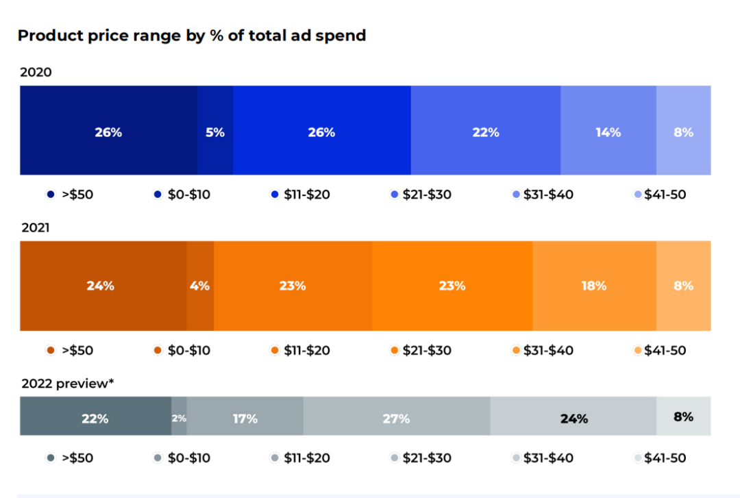 21-40美金的产品广告支出占比递增,说明越来越卷。