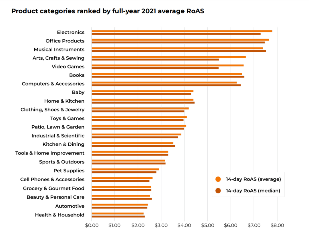 而对于选品来说,类目推广难度是我们需要考虑的。JS也是给出了2021年不同类目的ROAS情况。一般来说,ROAS低于3的类目,推广难度都会很大。