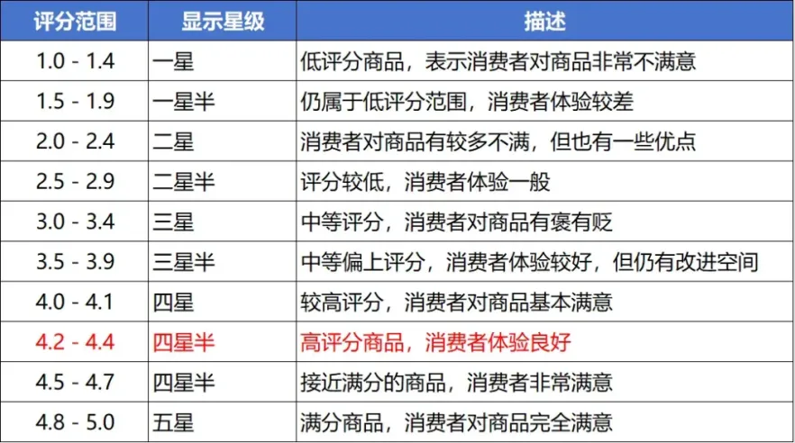 但如果是竞争惨烈的3C电子,门槛直接拉高到4.25分才配显示4.5星;家居用品则卡在4.20分。