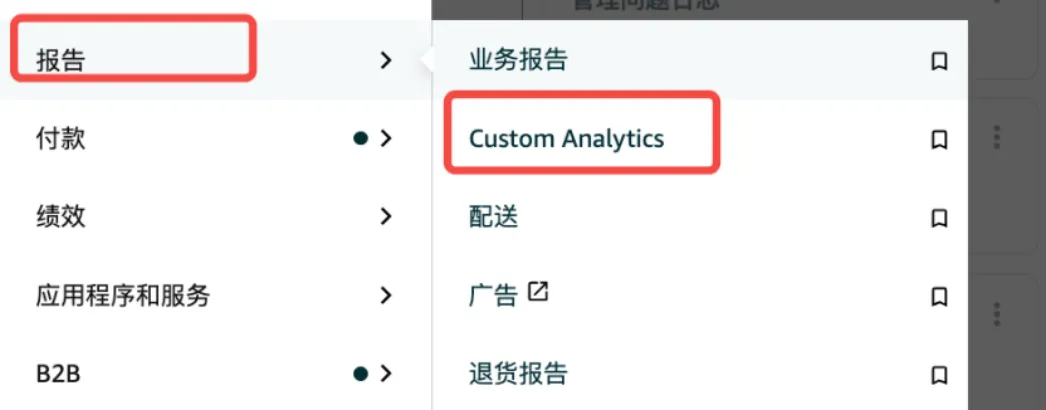 第一步:登录卖家后台,在导航栏找到「报告」模块,点击进入「自定义分析」。