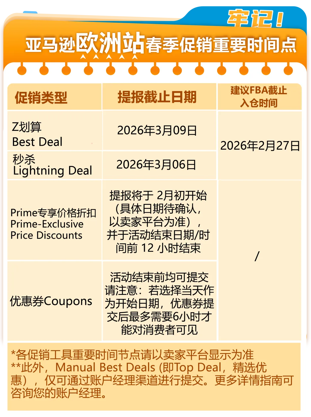 在促销工具层面,部分节奏已被提前明确:Best Deal(Z划算)提报截止至3月9日,Lightning Deal(秒杀)提报截止至3月6日,二者建议FBA最晚入仓时间均为2月27日;Prime专享价折扣预计2月初开启,需在活动结束前12小时关闭;优惠券则可在活动结束前持续提交,但“当天生效”仍存在最长6小时的延迟。
