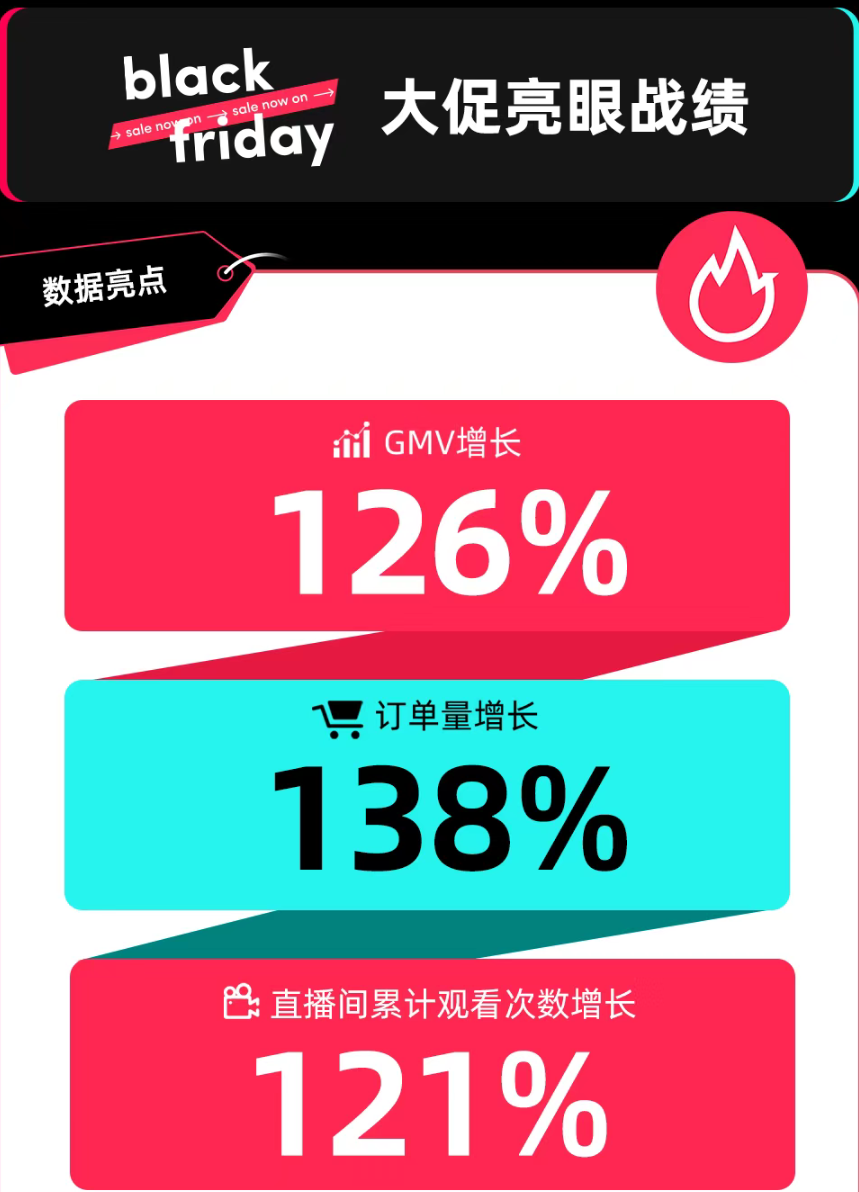 TikTok Shop官方近日公布了黑色星期五的战报,数据显示在活动期间,其GMV增长126%,订单量增长138%。商家在年末大促中可以重点关注家居、消费3C电子、玩具等热门品类。