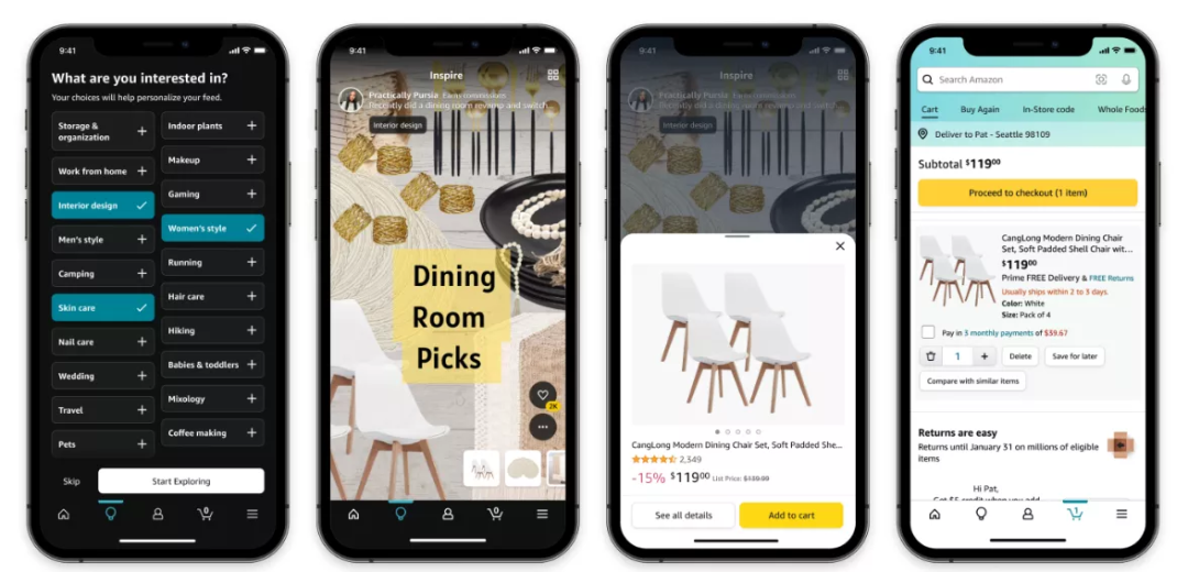 进入界面后,用户将能够按类别和兴趣过滤内容,亚马逊会给用户提供多达20个兴趣进行选择,比如室内设计、旅行、护肤等,一旦用户选择了自己感兴趣的话题,就可以开始浏览,从而以这种方式找到相关产品。