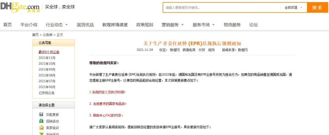 如今不止亚马逊要求EPR合规,Wish和敦煌网也都相继发布了公告,卖家自2022年1月1日起,商品销售至德国和法国没有EPR注册号将视为违法,卖家需拥有有效的EPR注册号。