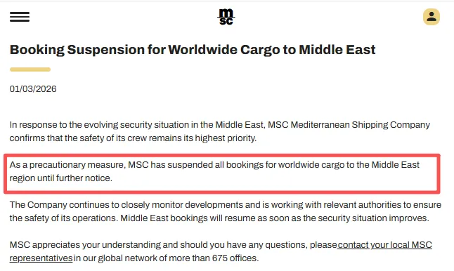 在班轮公司层面,MSC发布紧急通知,暂停全球范围内发往中东地区的新增货物订舱。同时,所有位于海湾水域或正在驶往该区域的MSC船舶,均被指示前往指定安全避风水域待命。