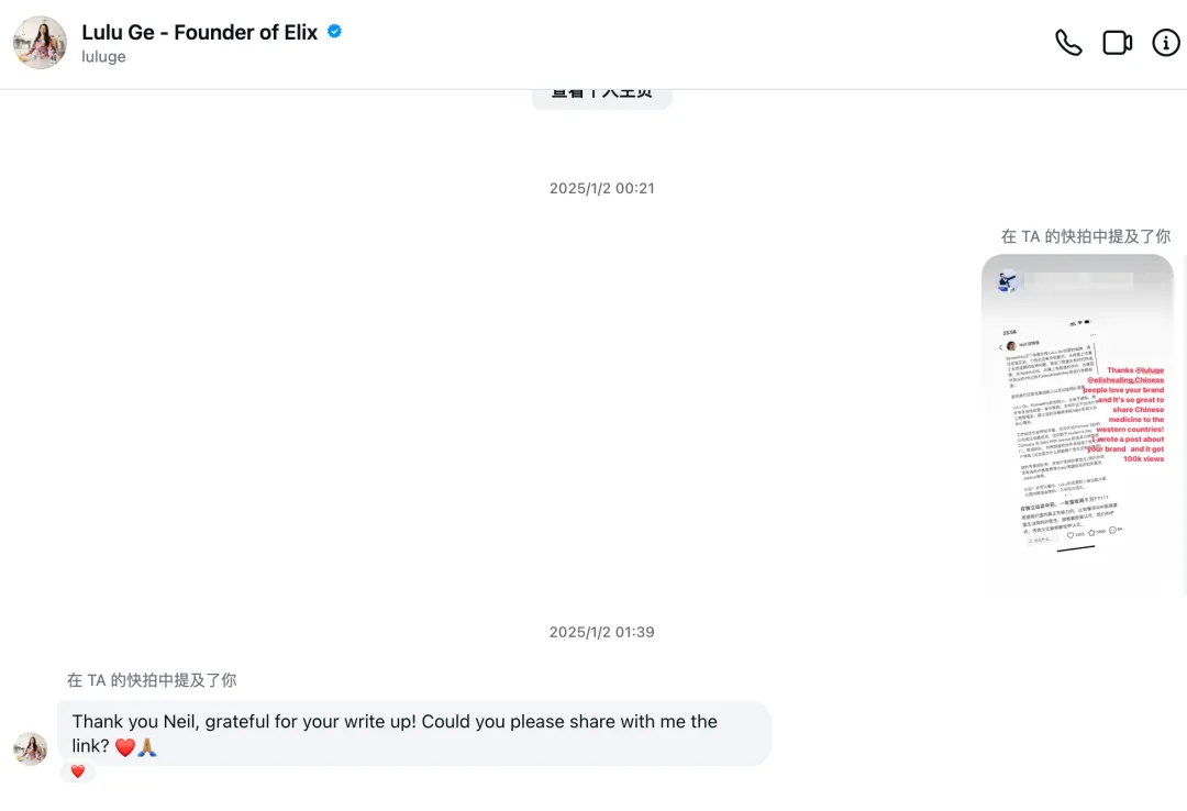 这里shout out一下创始人lulu,今年年初,也跟创始人Lulu在IG建联上了,她找我要之前那篇文章的链接。