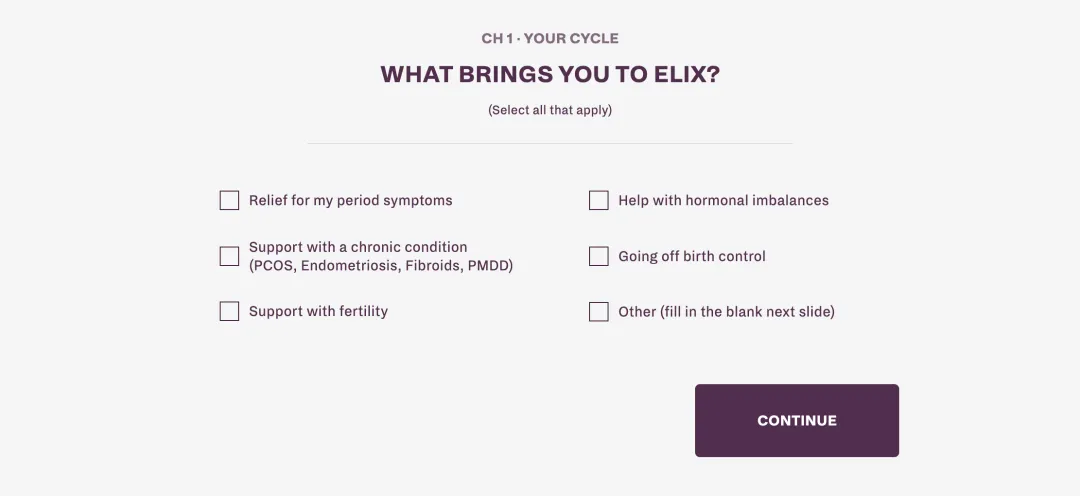 如果你去Elix的官网,去购买产品,你得先完成一份极其详尽的、包含 60 多个问题的在线健康评估,还需要和她们团队的医生约线上看诊会议,它会问你的舌苔颜色、经期血块情况、睡眠质量甚至压力水平,这套算法的背后,其实就是中医的辨证逻辑。