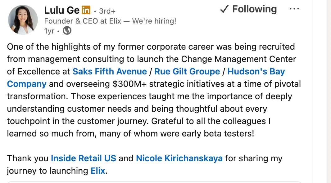 “在我过往的职场生涯中,最引以为傲的高光时刻之一,就是被从管理咨询行业挖掘,去为 Saks Fifth Avenue、Rue Gilt Groupe 以及哈德逊湾公司(Hudson's Bay Company)创立‘变革管理卓越中心’(Change Management Center of Excellence)。在那个关键的转型时期,我负责监督执行了超过 3 亿美元的战略举措。
