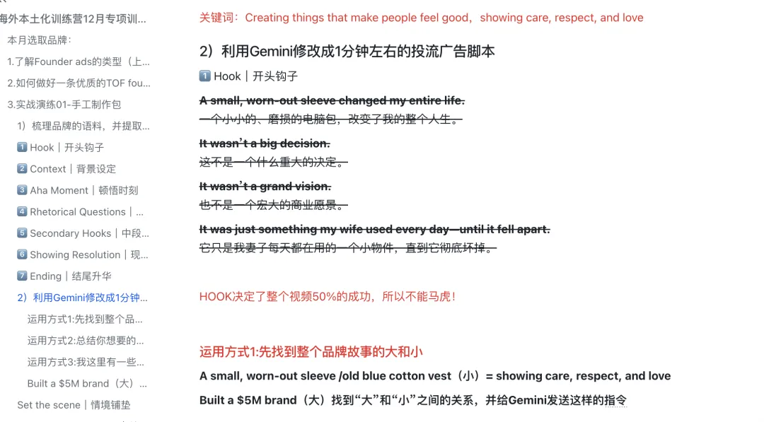 这也是我们海外本土化社群,前两天刚刚在创始人故事广告专题训练,讲过的东西,在写创始人故事的时候,我们要进行简单的前期访谈,并让创始人提供的品牌语料(全英文),从语料提取出关键词,找到故事的逻辑关系,结合AI,用不同的方式写出接近本土水平的高转化故事。