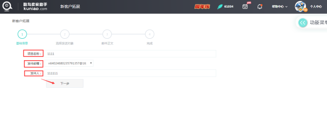 进入后输入本次营销的命名,选择要发送的邮箱主题(建议是站外、非亚马逊店铺注册邮箱)以及店铺昵称