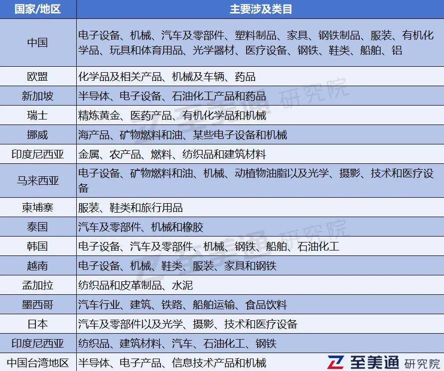 美国贸易代表办公室还在本次调查中进一步列举了16个经济体被美国主要关注的出口类目: