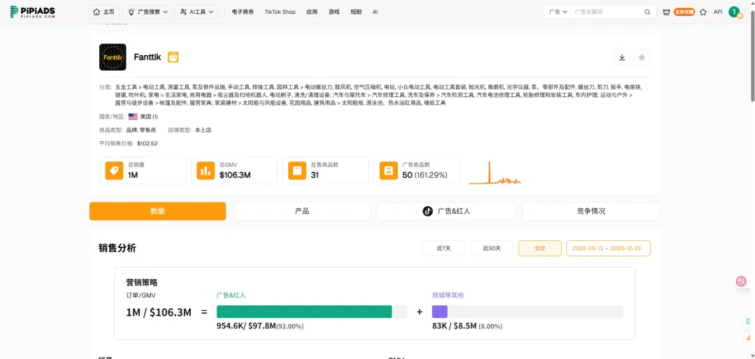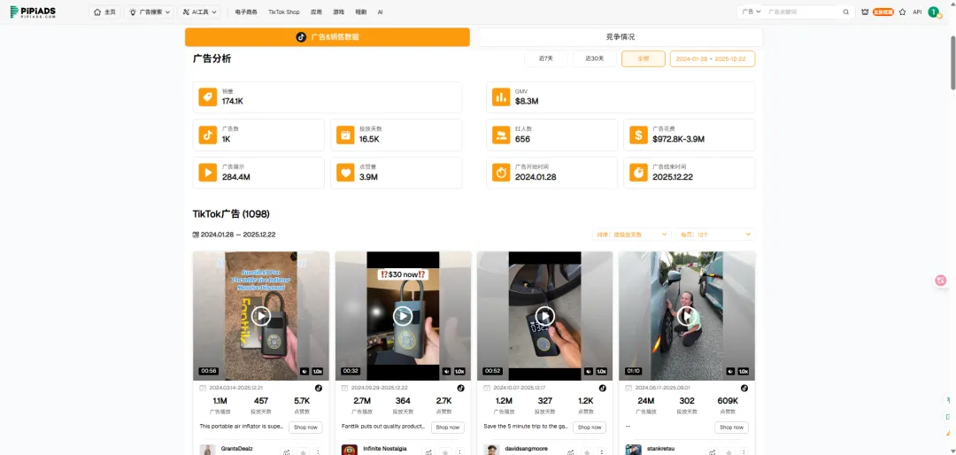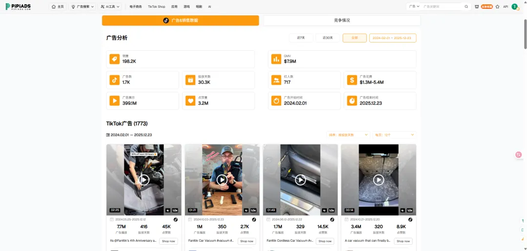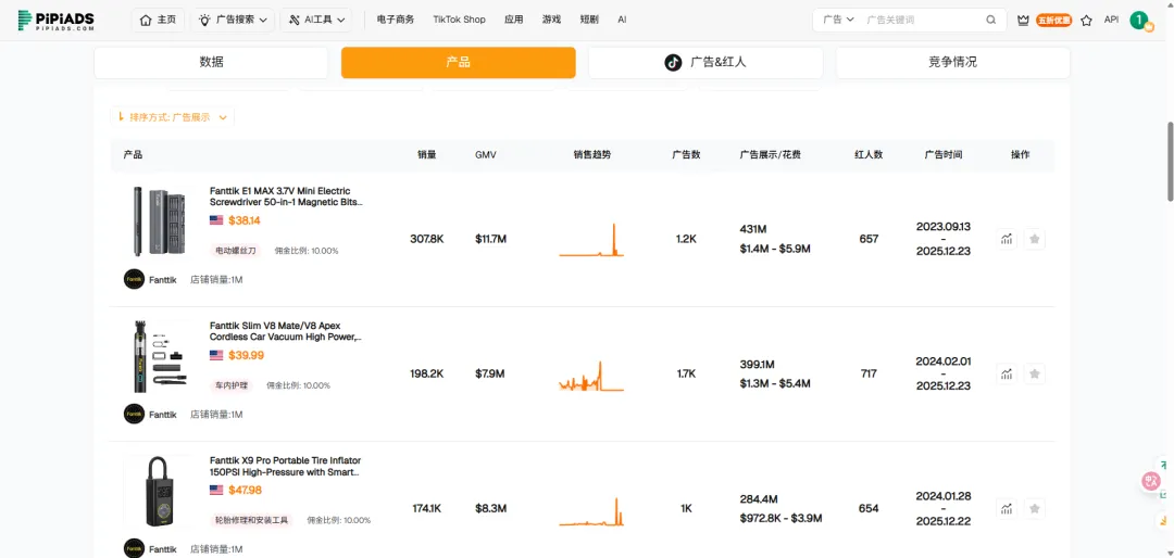 在 PiPiADS 的 Fanttik 广告与销售数据中,车载吸尘器并没有呈现出短期集中爆发的特征,而是以较为稳定的节奏持续投放。广告数量、红人参与度和整体曝光,都维持在一个长期可复用的区间内。这意味着它并不是被某一次节点或情绪推动,而是在日常使用场景中被反复验证。