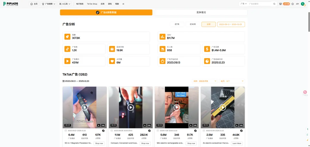 在 PiPiADS 的 Fanttik 产品数据中,最先被放大的,是这款迷你电动螺丝刀。它在广告展示、投放持续时间和销量等核心指标上,长期保持在同一高位区间,并非短期冲量形成的结果。但这并不是一款靠参数取胜的工具。广告中反复呈现的,只是一个极其简单的使用过程:拿起、按下、完成。几乎