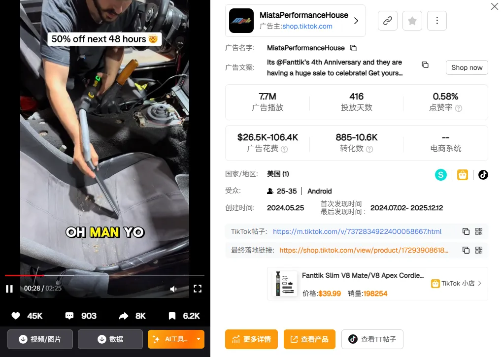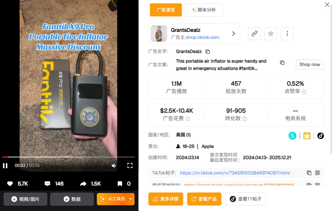 在 PiPiADS 的 Fanttik 便携充气泵广告记录中,这条便携充气泵视频是当前投放周期最长的素材。从 2024 年 3 月开始上线,到现在仍然持续被使用,横跨多个阶段,没有明显的集中爆量节点,却始终没有被淘汰。
