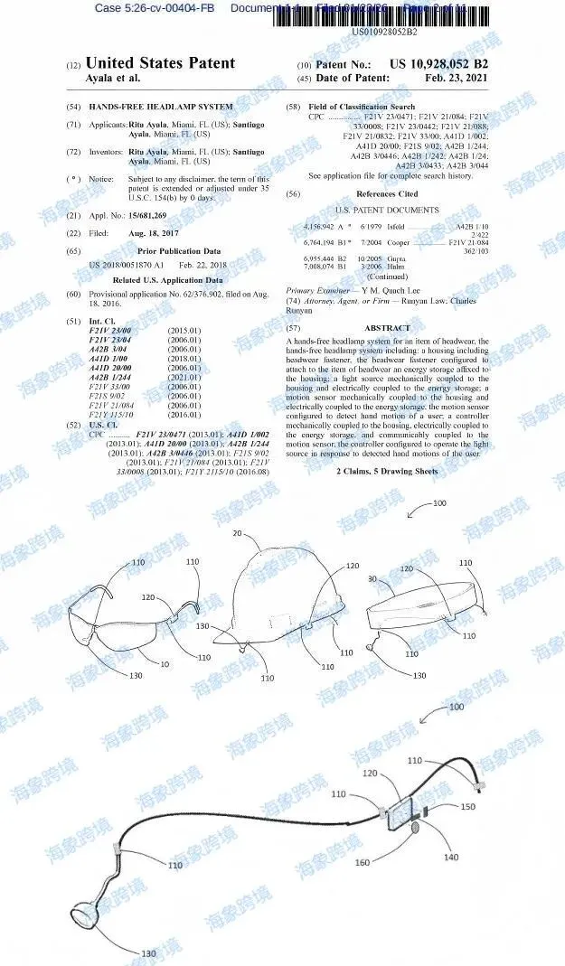 专利起诉25-cv-404免提头灯专利和26-cv-917空调适配器电源线和25-cv-10736、25-cv-10740睡眠唇贴
