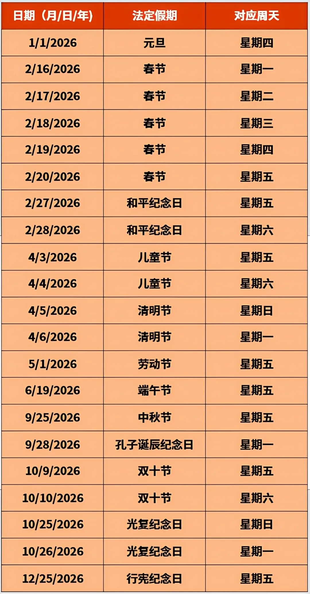 对于物品所在地为中国台湾地区的交易,eBay在计算订单处理截止日以及承诺送达时,下表所列的2026年相关假期将视为法定假期而非工作日进行计算。