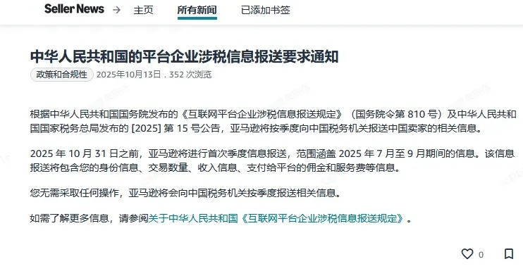 2025年6月20日,国务院公布《互联网平台企业涉税信息报送规定》,明确了平台企业向税务机关报送平台内经营者涉税信息的义务。亚马逊于10月13日正式启动信息报送工作,涵盖美国、澳大利亚等22个主要站点的中国卖家,均在此次报送范围内。