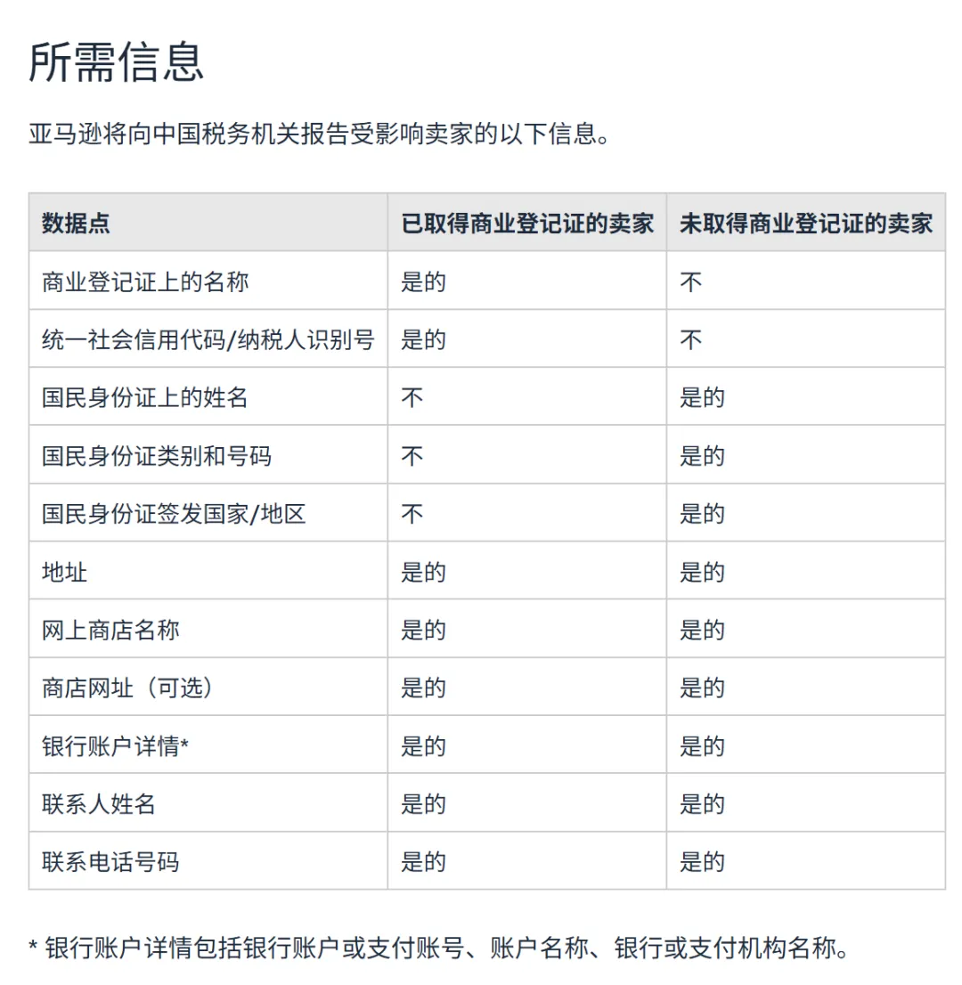 根据国家规定与亚马逊公告内容,平台需定期向税务机关报送以下信息: