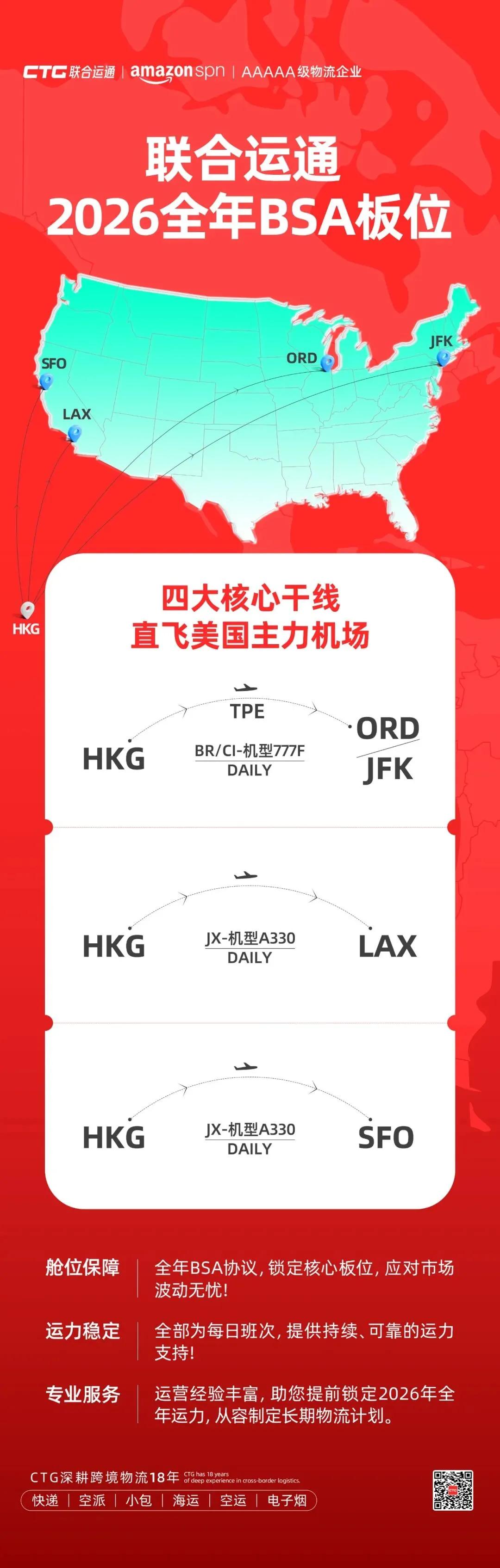 新增纽约、芝加哥板位!CTG2026年全年BSA包板新航线发布!