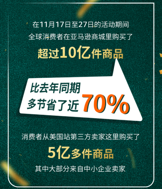 上周,亚马逊发布战报称,在11月17日至27日的黑五网一再次打破了记录,活动期间,全球消费者在亚马逊商城里购买了超过10亿件商品。消费者从美国站第三方卖家这里购买了5亿多件商品,其中大部分来自中小企业卖家。
