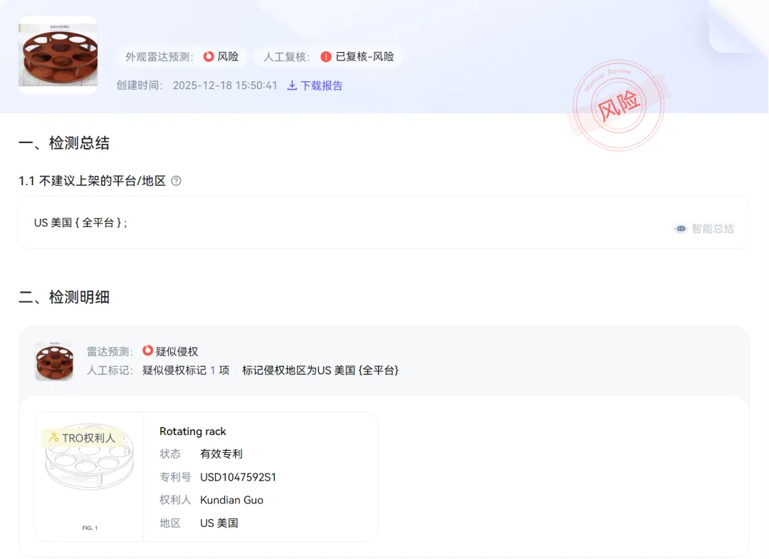 将此次发起维权的产品图片上传至睿观外观专利检测功能后发现,该产品已有生效专利,且已有TRO维权史: