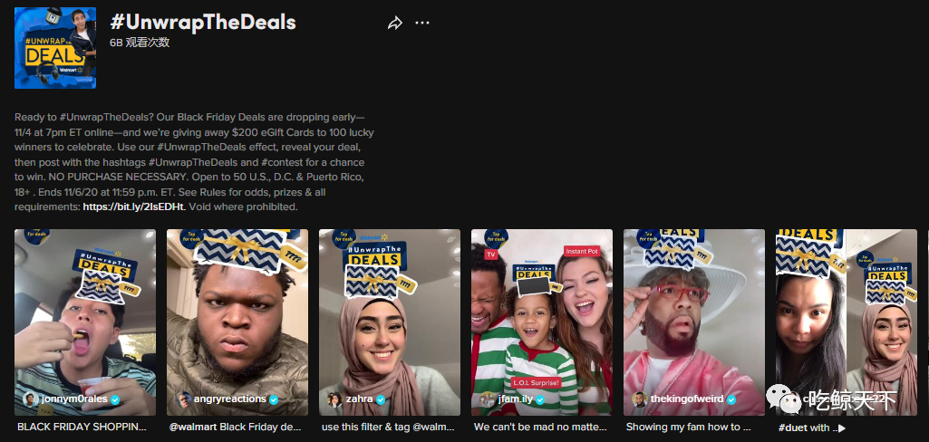 2019年黑五期间,沃尔玛在TikTok 上发起#DealDropDance标签挑战活动,吸引用户通过TikTok在沃尔玛上购买产品。