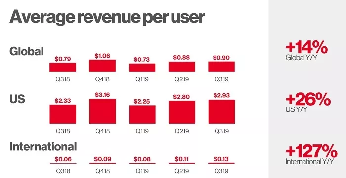 上图可见,Pinterst除美国外在国际市场也非常受欢迎,国际用户利润飙升。