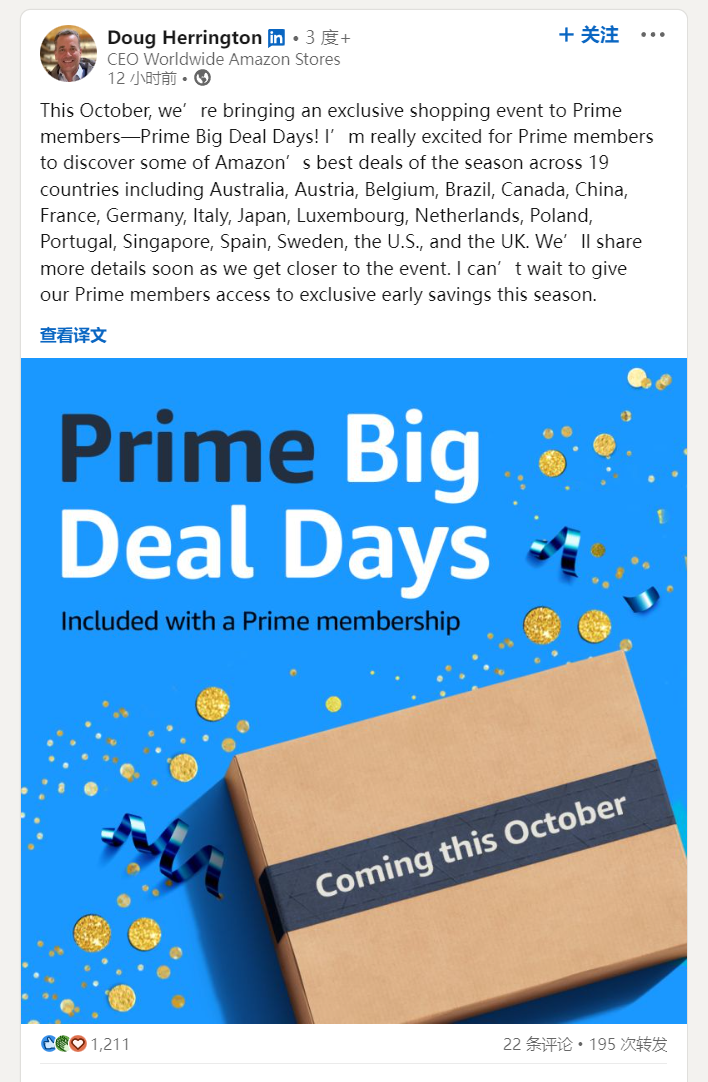 亚马逊品牌旗舰店首席执行官Doug Herrington在公告中表示:“随着活动的临近,我们很快将分享更多的细节。我们迫不及待地想让我们的Prime会员在这个假日购物季提前享受到独家优惠。”