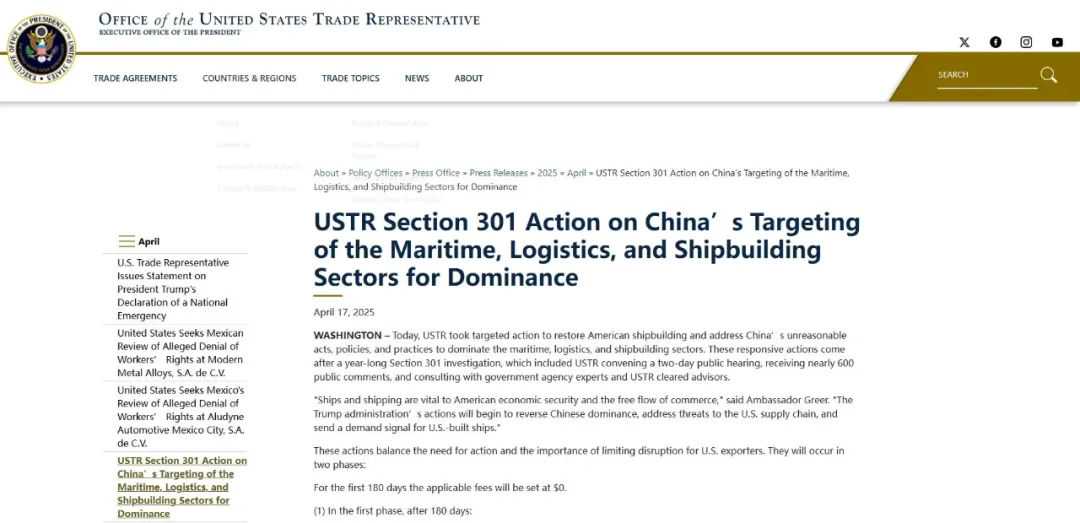 早在今年4月,美国贸易代表办公室(USTR)公布了对中国建造船只征收港口费的具体细节。