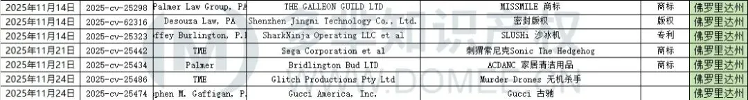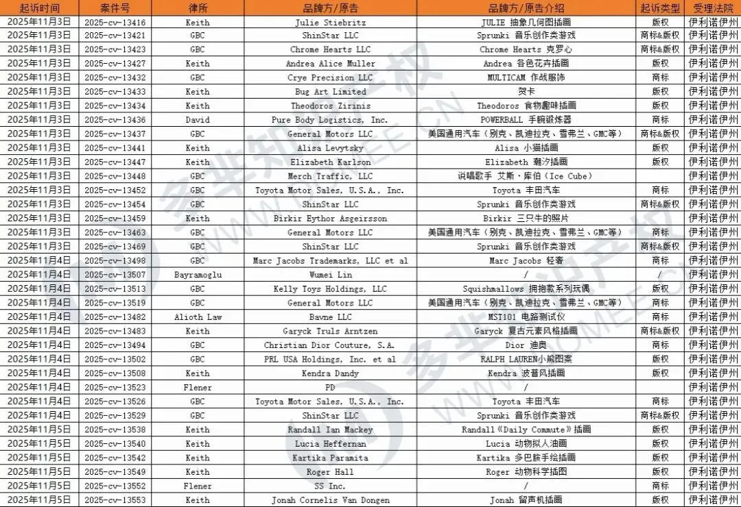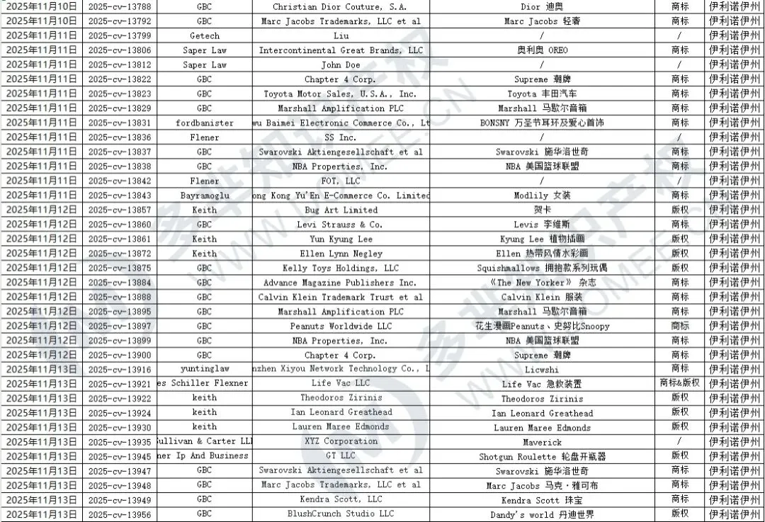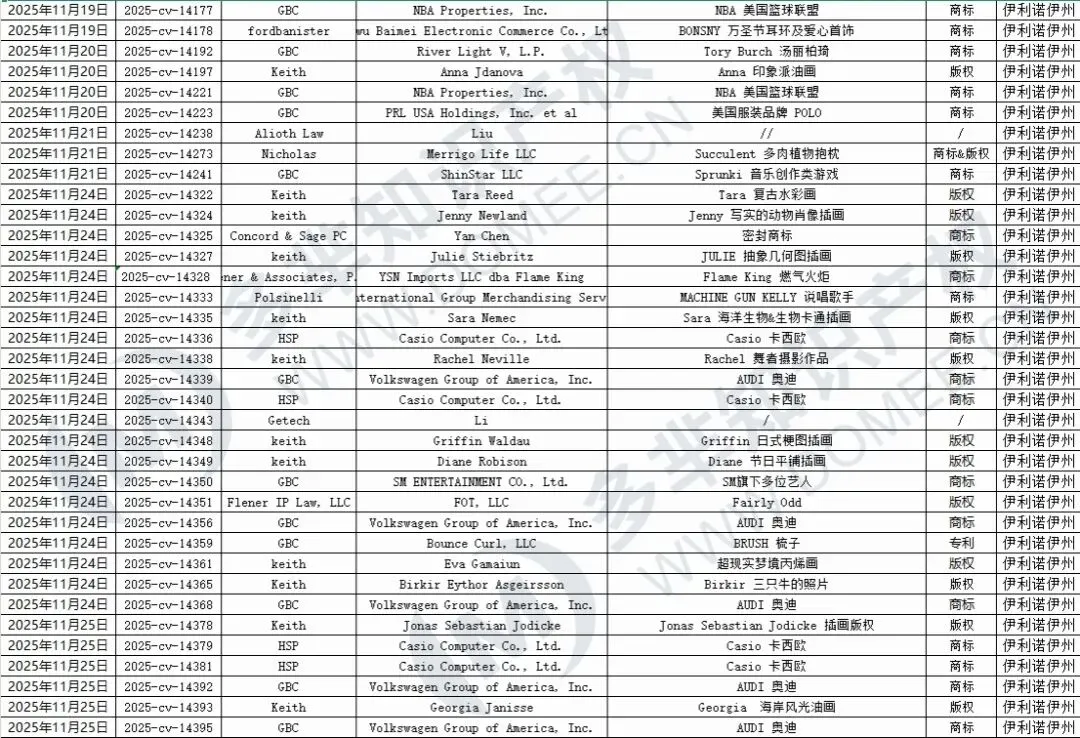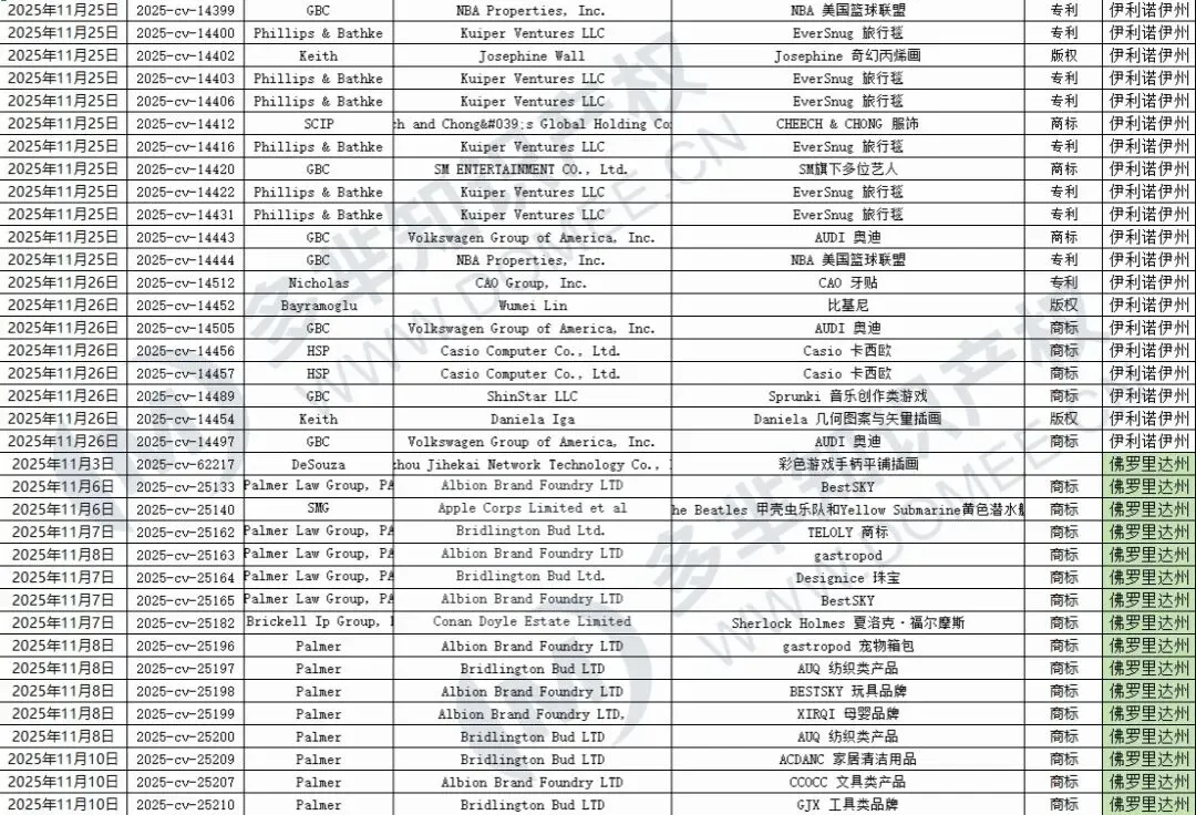 据不完全统计,2025年11月的TRO案件共222起。主要还是发生在伊利诺伊州北区法院和佛罗里达州南区法院。