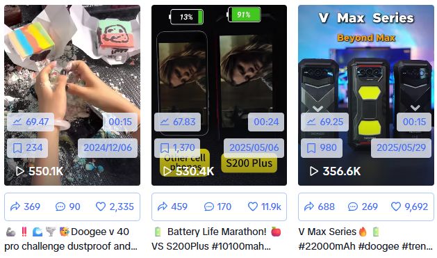 社媒上,它的 TikTok 官号更是把 “短平快测试” 玩到极致:Doogee 的 TikTok 官方账号能在 150.7K 粉丝基础上,持续产出播放量超 50 万的爆款,核心在于把 “无口播实测” 做成了标准化的内容模板。