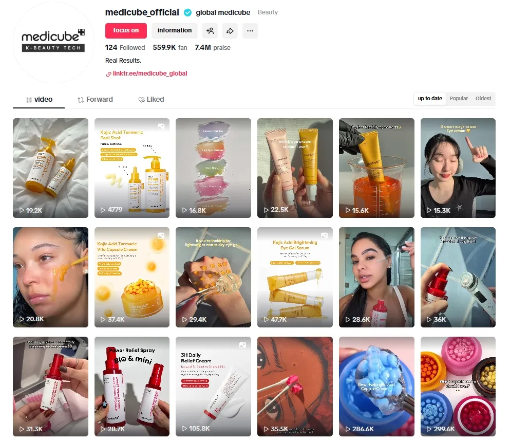 这种内容风格有效降低了用户的广告抵触心理,显著提升了算法推荐效率与自然传播效果。对于 18-35 岁、追求真实功效与高性价比的核心受众而言,“真实可信的内容” 远比千篇一律的传统广告更能促成决策转化。目前,Medicube 全球官方社媒账号已积累 55.99 万粉丝,收获 740 万点赞,核心围绕 “真实效果(Real Results)” 输出内容,形成了极具辨识度的品牌内容标签。