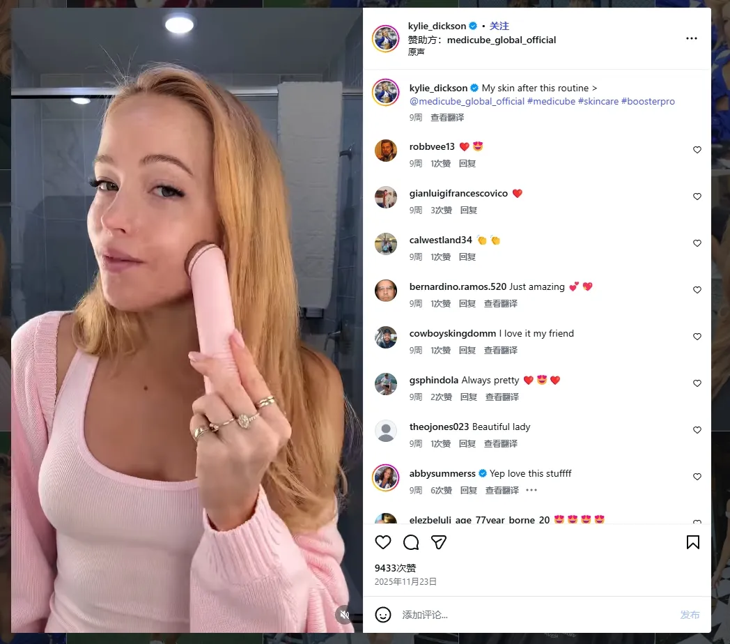 Kylie Dickson 是活跃在 TikTok 与 Instagram 的中腰部护肤内容创作者,粉丝规模在数十万量级,受众以 20–35 岁普通护肤用户为主,她们并非专业成分党,但高度关注产品是否真的“对普通人有效”。在 Medicube 的合作内容中,Kylie 以自身皮肤困扰为切入点,记录真实使用过程与主观感受,通过日常化叙事和近距离肤况展示,弱化商业感,强化“普通用户真实体验”的可信度。相关视频普遍获得几十万至百万级播放量和数万点赞,评论区频繁出现“我也有同样问题”“是否适合敏感肌”“已加入购物车”等反馈。这类内容有效承接了头部红人建立的信任心智,将 Medicube 从“看起来不错的品牌”转化为“值得被认真考虑的护肤方案”,对品牌搜索量和转化意向的提升具有显著推动作用。