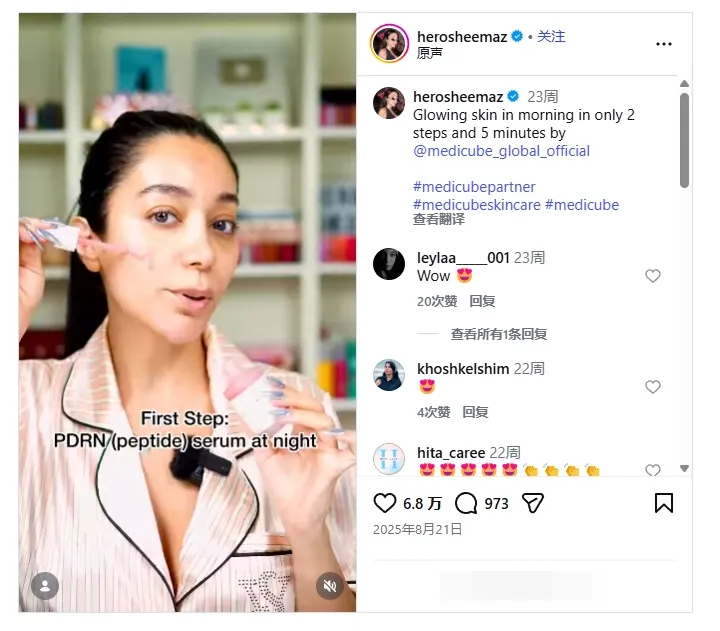 herosheemaz是一位以高完成度视觉内容见长的跨平台美妆与生活方式博主,其受众更偏向注重审美、氛围与生活品质的年轻女性群体。在与 Medicube 的合作中,她通过干净统一的画面风格、近景皮肤状态呈现以及流畅的产品使用镜头,将 Medicube 的美容仪与护肤产品置于“高端日常护肤仪式感”的语境中进行表达。这类内容在 Instagram Reels 上普遍获得百万级播放和数万级点赞,并被大量收藏与二次转发。相比直接讲解功效参数,她的内容更侧重情绪价值和品牌视觉形象塑造,帮助 Medicube 在社媒中形成稳定、统一且高端的内容感知,强化其在海外市场中“功效护肤+科技感”的品牌认知。