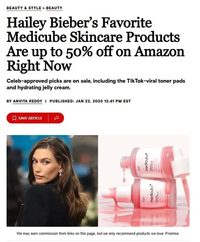 在红人矩阵之外,Medicube 还通过与 Kylie Jenner、Hailey Bieber 等全球级明星的自然内容曝光,实现了品牌声量的跨圈层引爆。这类内容多以日常分享、活动出镜或随手使用为主,并非强广告表达,却因明星本身的巨大影响力迅速引发模仿与讨论,触达大量非美妆核心用户。相关内容往往在短时间内带来数千万级曝光,并显著拉升 Medicube 在 TikTok 等平台的品牌搜索量与自发内容产出。这一层级的合作更多承担的是“制造全民认知与话题度”的功能,为品牌后续在达人与用户端的持续扩散创造更有利的舆论与算法环境。