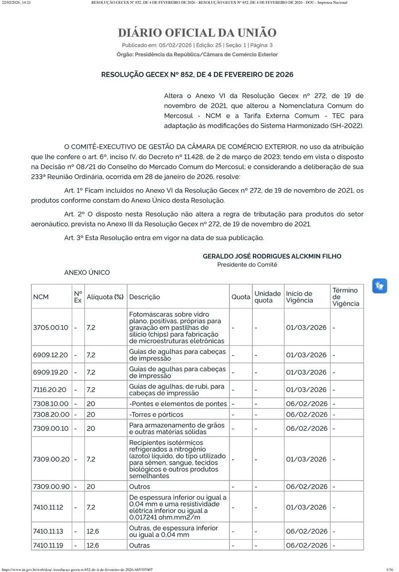 巴西外贸委员会管理执行委员会(GECEX)于2026年2月4日发布第852号决议,打响了本轮贸易保护的第一枪。