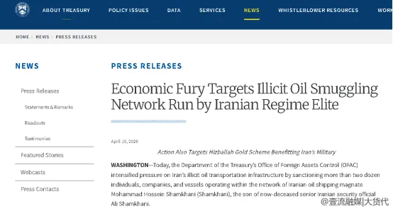 在当地时间4月15日,美国财政部发布新闻稿,宣布OFAC(外国资产控制办公室)已对伊朗石油走私网络实施新一轮的严厉制裁。