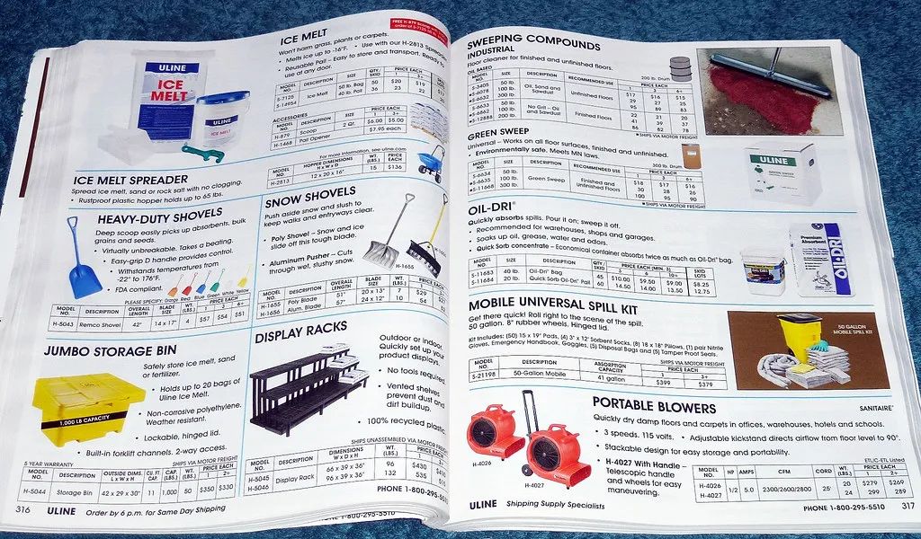 大家仔细去设想一个美国的这些仓库型的企业,往往就是各种的经销商,分销商类型的公司。每天都是忙忙碌碌,难得有比较多的时间浏览网页,一边做事,一边带着耳麦,用电话直接咨询了需要的产品,直接电话就下单。商业的目的时间效率很多时候就是要就在旁边,刚好方便,正好找到。所以,很多的办公室收到ULINE的产品目录常常叠在一起非常显眼方便。拿起一番,一下子就找到办公室或仓库需要的用品。