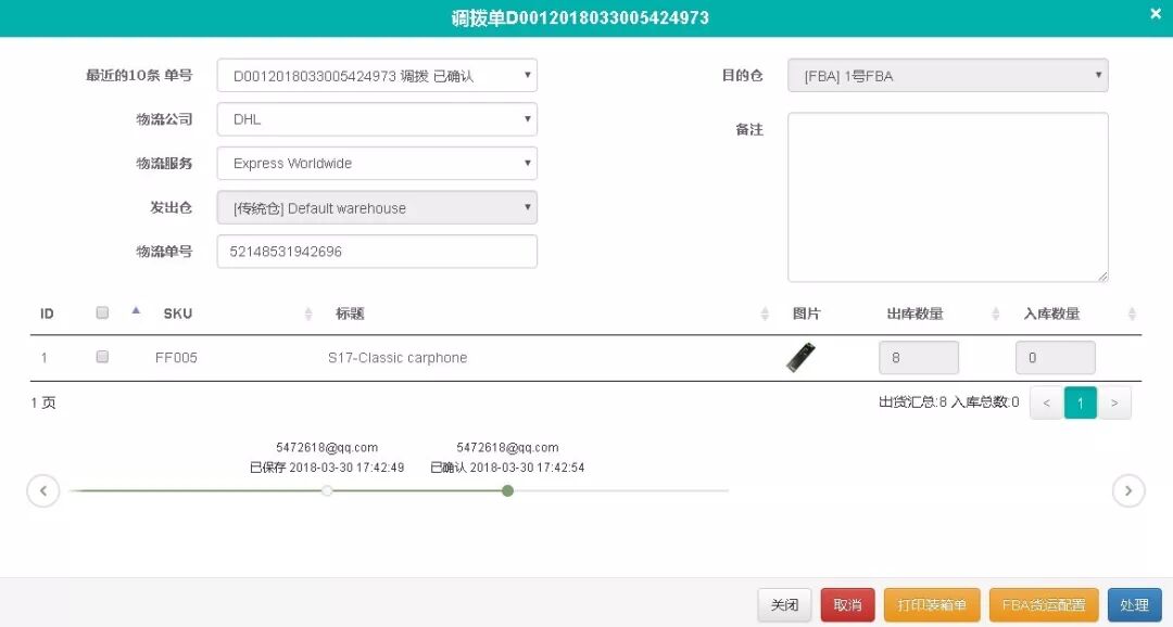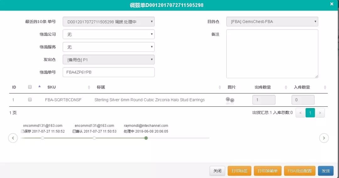 点击处理后生成调拨单,按发货键就能向FBA仓库发货了
