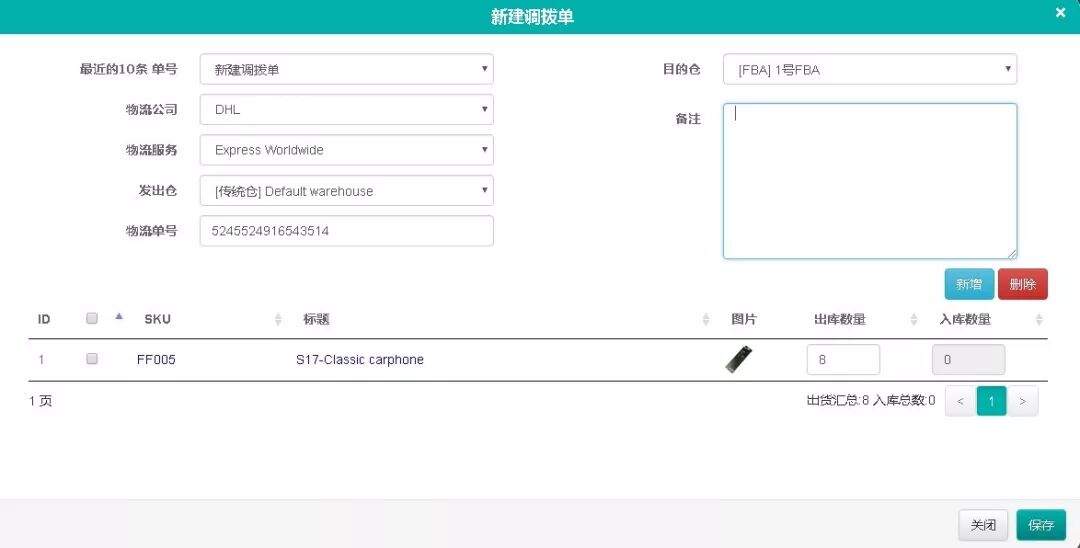 2、新建调拨单,填写发往FBA仓的产品数量和物流公司及物流单号,点击保存